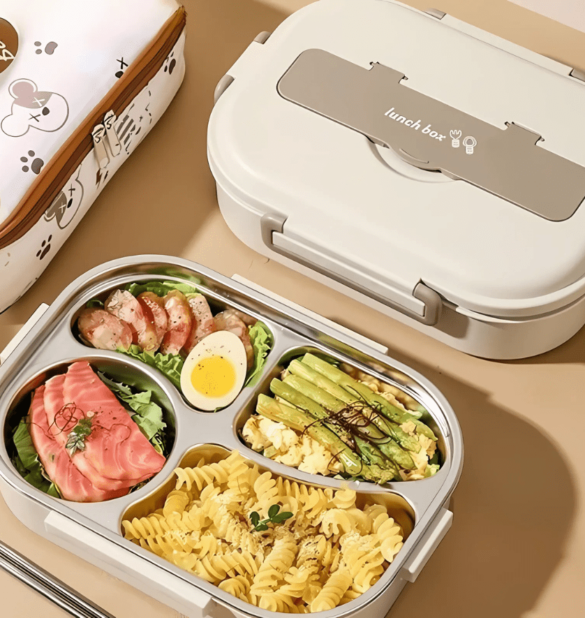 - Praktische Fächer: Die LunchInox verfügt über 4 oder 5 Fächer (je nach Modell), die es Ihnen ermöglichen, verschiedene Gerichte, von Vorspeisen bis Desserts, ohne Geschmacksvermischung zu trennen. Sie enthält auch eine spezielle Schüssel für Saucen oder Suppen und bietet somit eine vollständige Lösung für jede Mahlzeit.