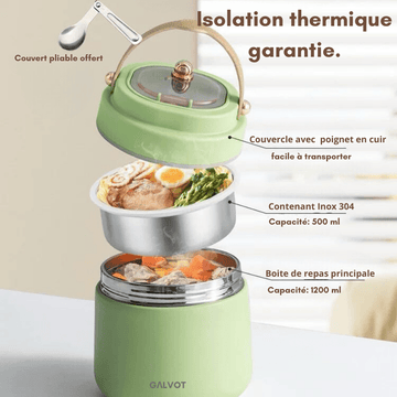 - Isolation thermique performante. Grâce à sa double paroi en acier inoxydable, elle garde vos plats chauds pendant 6 heures et vos repas froids jusqu'à 8 heures, assurant une dégustation toujours agréable.